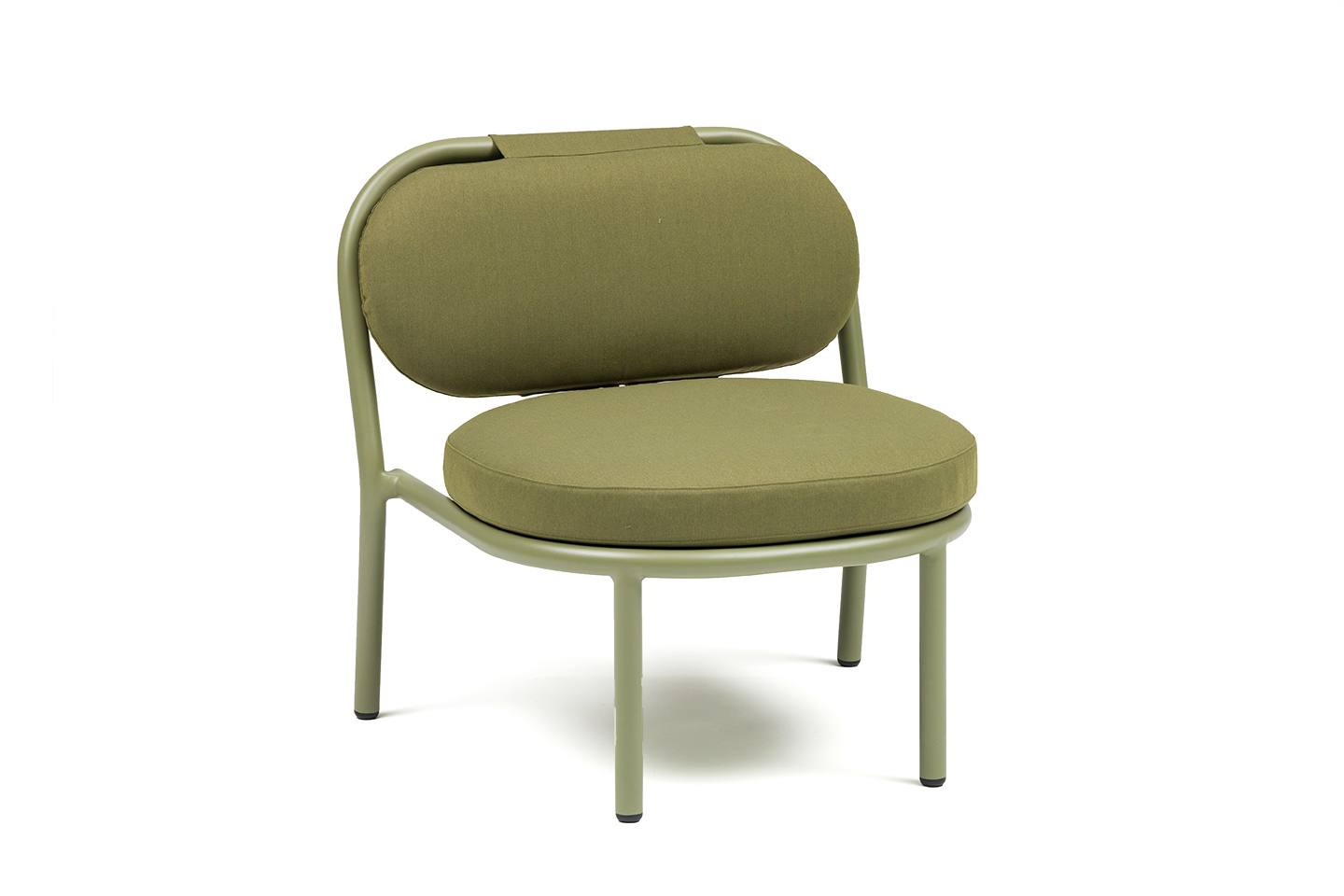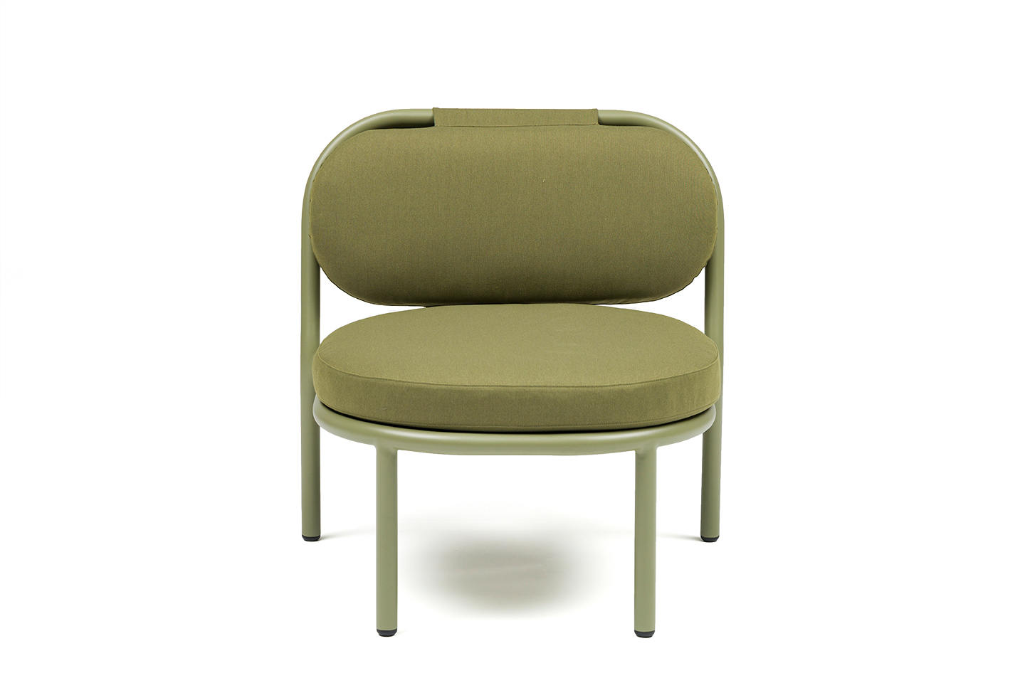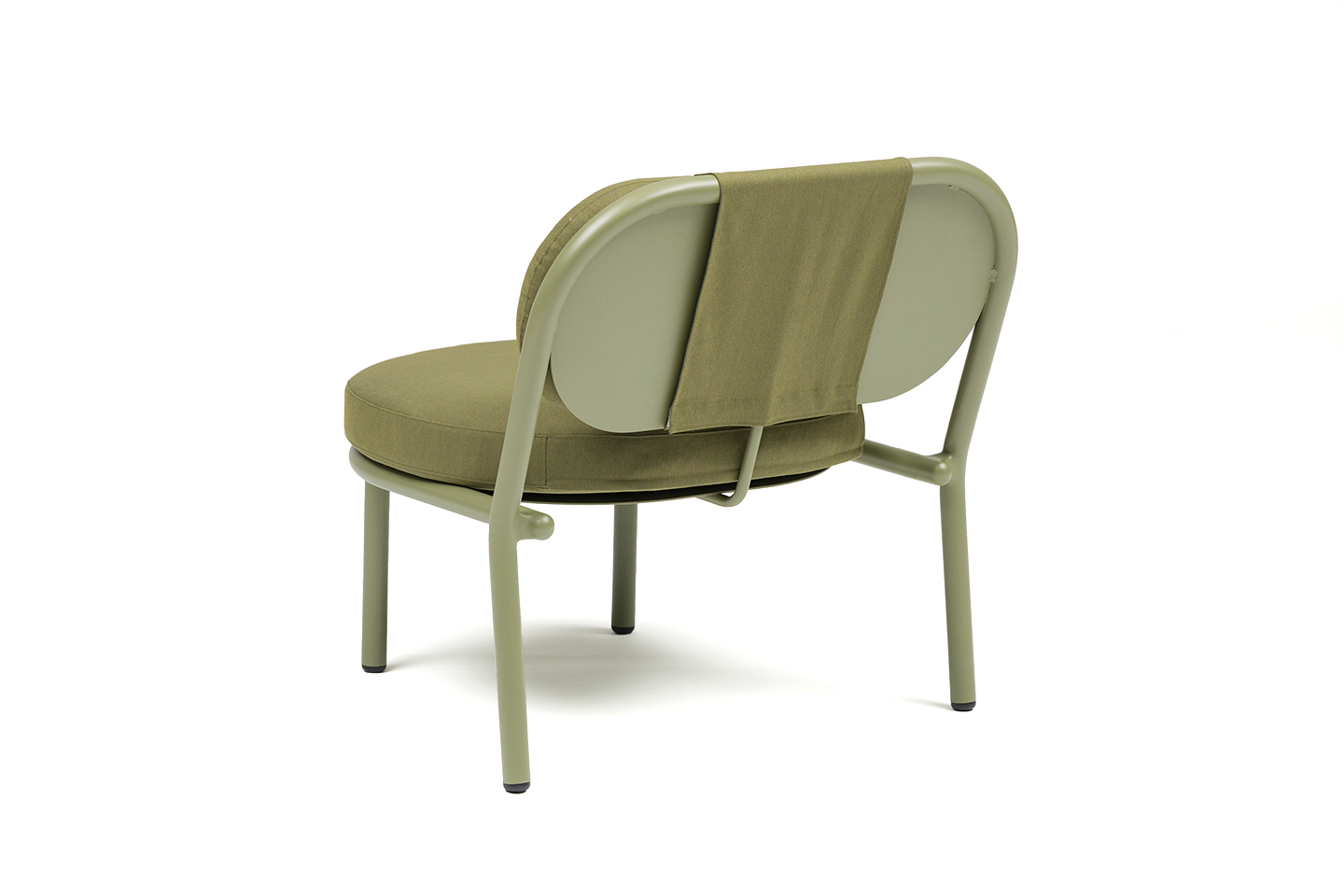 MARAMA low seat: Made from aluminum tubes and covered in outdoor fabrics, it is inspired by the moon and its play of shadows, translated into light and airy volumes.